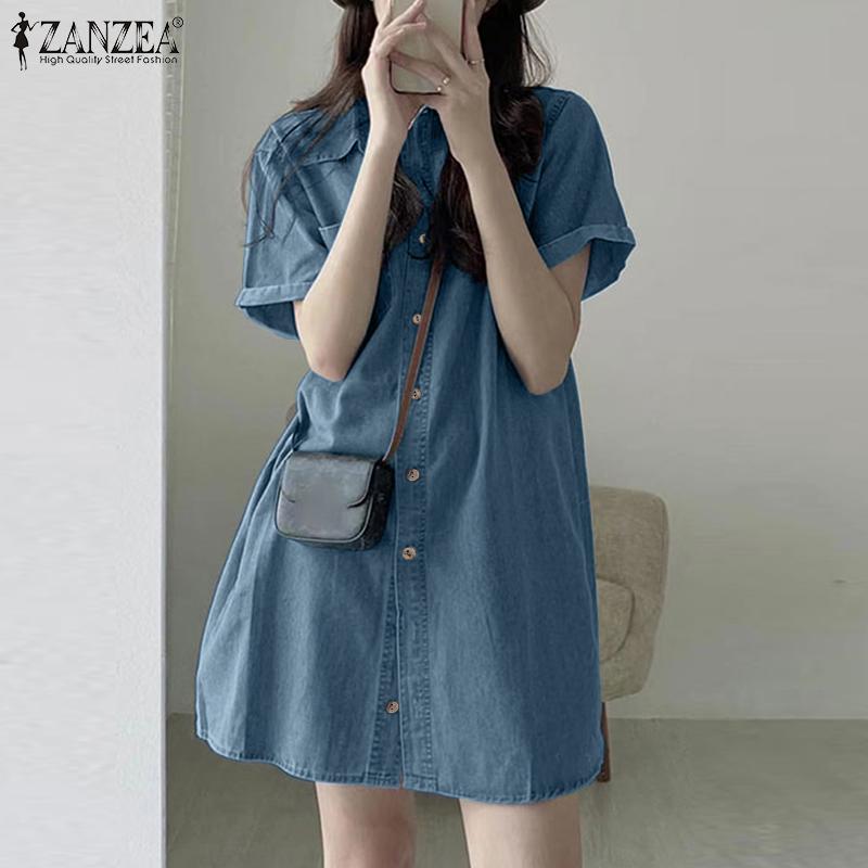 ZANZEA Vestido camisero informal de verano de manga corta con cuello vuelto para mujer