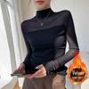 Stylish Slim-Fit Patchwork Lace Mesh Velvet Base Layer Top - High-Neck, Long-Sleeved for Autumn/Winter 2025
