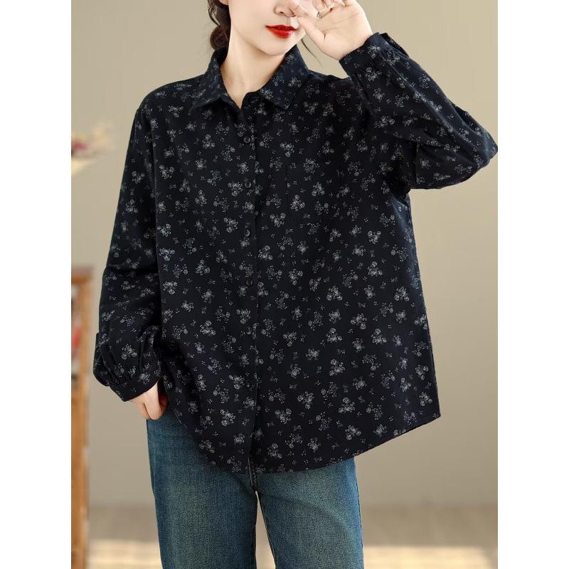 Women's Long Sleeve Retro Floral Cotton Shirt - Loose Fit, Slimming Temperament, Thickened Base Layer