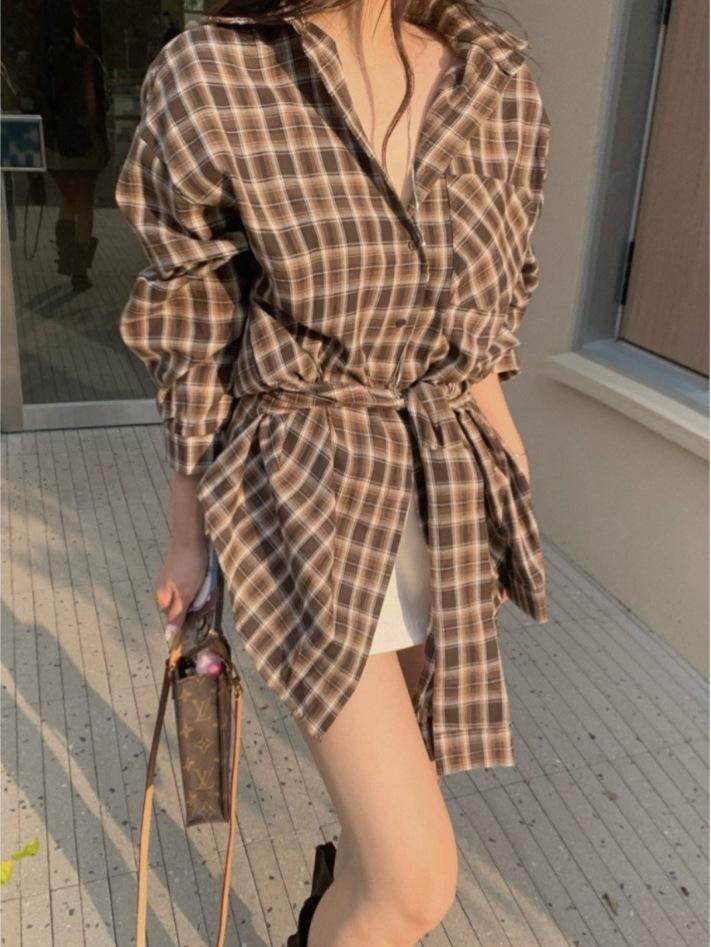This stylish women's shirt features a retro plaid design, offering a timeless look perfect for any casual outing or laid-back event. Made from high-quality cotton, it ensures a breathable and comfortable experience throughout the day. The long sleeves and loose fit provide a relaxed yet polished silhouette, while the tie waist enhances your figure by adding a touch of femininity. The tailored lapel neckline adds a sophisticated detail, making this shirt a versatile staple in your wardrobe.