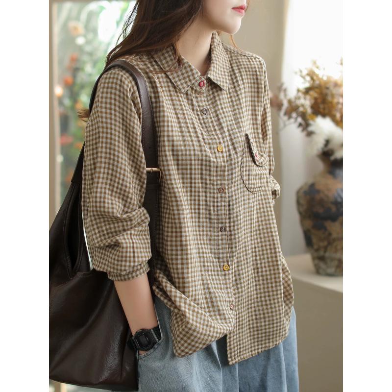 2026 Double-Layer Cotton Women's Plaid Shirt - Korean Style, Loose, Retro, Slimming