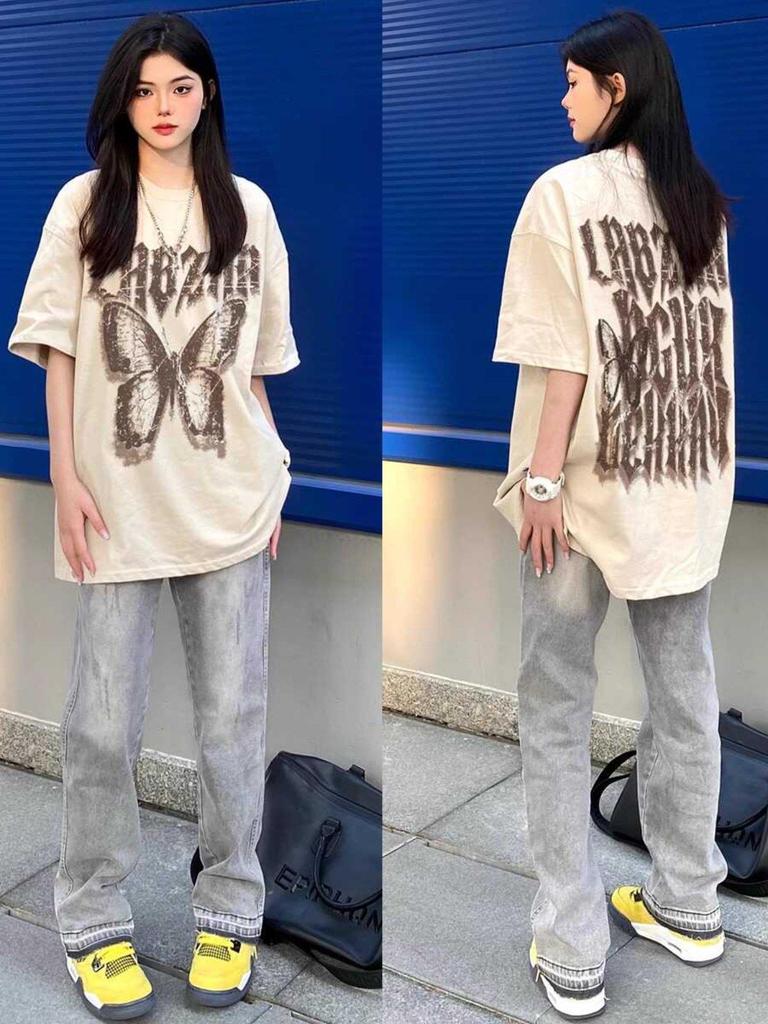 This Women's Plus Size T-Shirt features a charming butterfly print and is made from soft, breathable cotton. It boasts a short sleeve design with a round neckline that offers both style and comfort. The T-shirt provides a slimming yet loose fit, making it a versatile choice for both casual outings and coordinated looks for couples. The playful letter decoration adds a unique touch to its overall appeal. Perfect for warm weather, this T-shirt effortlessly combines fashion and comfort.