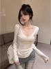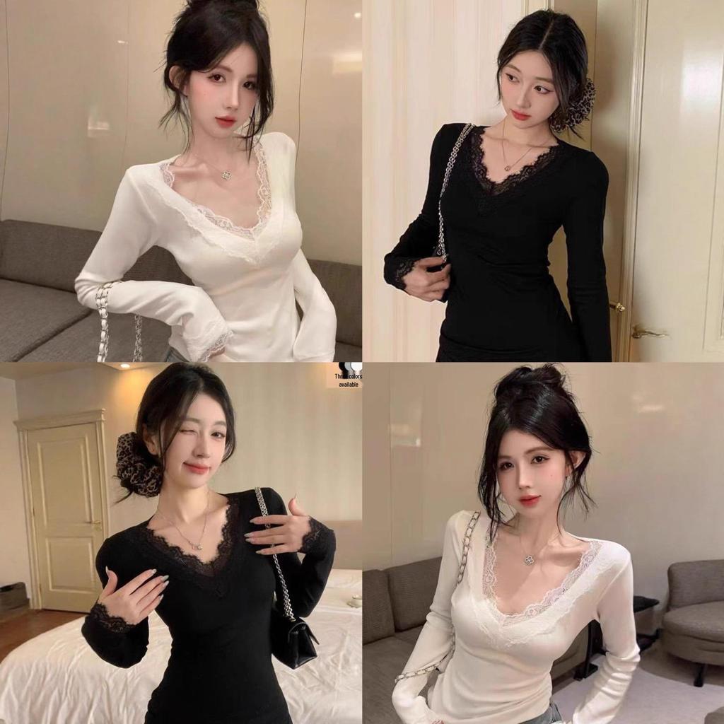 Lace Trim V-Neck Long-Sleeve Brushed T-Shirt with Cashmere Fur Lining for Women - Autumn/Winter Collection.