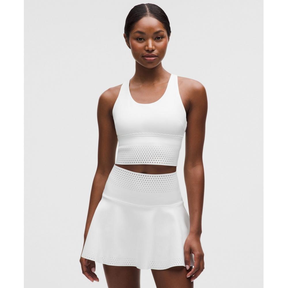 A/C included. This four-way stretch tennis tank has laser-cut perforations at the under band for added airflow where you need it most. Adjust the shoulder straps to find your perfect fit.