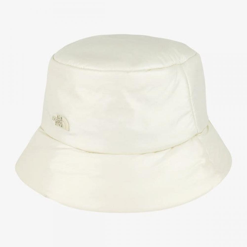 The North Face Plumpy Padding Hat CREAM (model number: NE3HR52K) is a winter bucket hat made with Ecoloft™ HEAT EX insulation, providing warmth while being lightweight. The hat features a naturally glossy, lightweight, and fluffy fabric that gives it a richer padding feel compared to conventional bucket hats, creating a cozy and voluminous silhouette. A luxurious metallic logo embellishes the front, adding a stylish touch to its simplistic design. The interior utilizes a soft fleece lining that maintains warmth for extended periods, enhancing its insulation for winter.