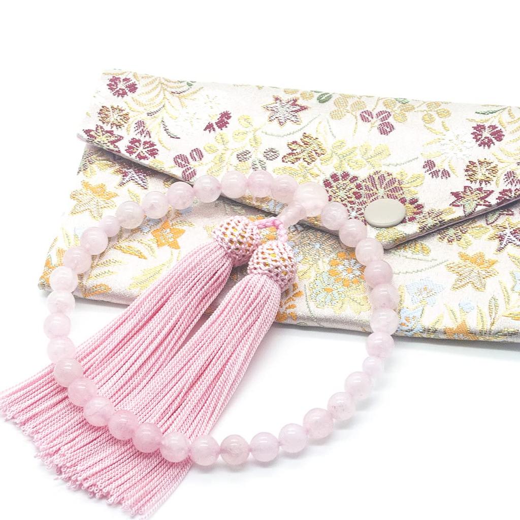 Eizen Nenjuya Handmade Prayer 8mm Rose Quartz Gold Brocade or Informal Women's Beads, Beads, Case, Funeral, Wake, Ceremony.