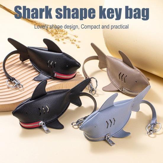 Leather Shark Key Bag Cute Shark Shape Car Key Bag Backpack Charm Shark Pouch with Keyring And Lanyard Zippered Coin Purse