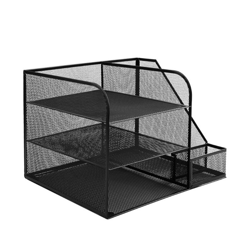 Desk Paper File Tray Organiser 3-Tiered Metal File Letter Tray With Book Rack Space Saving Document Organiser For Office