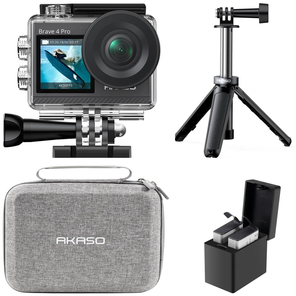 High-Quality 4K Action Camera with Touchscreen: The AKASO Brave 4 Pro action camera captures professional 4K/30fps high-definition video, eliminating graininess even when zoomed in, and beautifully captures still images. Enjoy high-quality recording with ease. Equipped with a high-performance Sony sensor, it captures high-quality 20MP photos. It also features a 2.0-inch touchscreen LCD screen for intuitive and quick setting adjustments, making it easier than physical buttons. The dual-color screen lets you instantly review your footage, making it easy to create amazing videos for Instagram and YouTube. It also comes with a selfie stick and storage case, perfect for capturing perfect footage for exercise and travel!