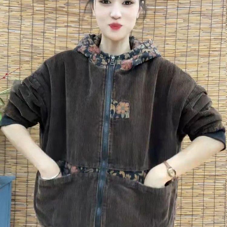 Women's Retro Hooded Corduroy Jacket - 2025 Winter Thick Velvet Cotton, Loose Fit, Plus Size, Body Concealing Casual Wear