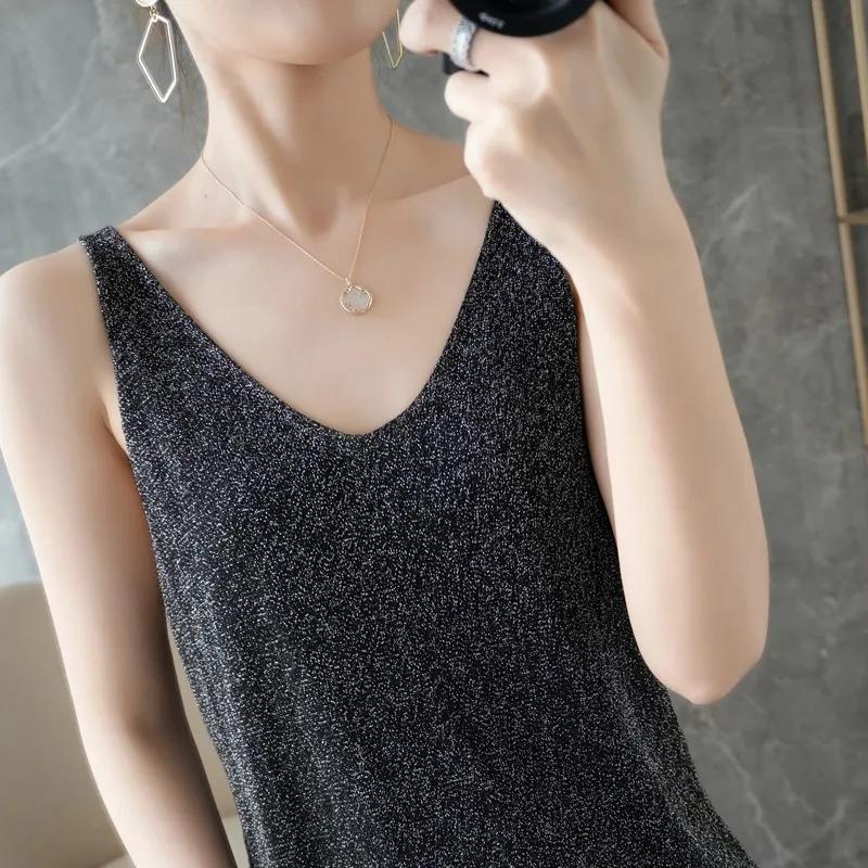 Women's Black Glitter V-Neck Tank Top Sleeveless Slim Fit Casual Camisole