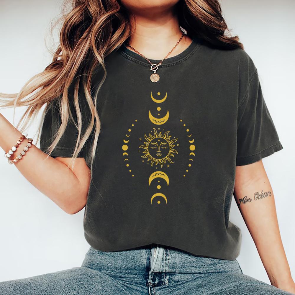 Sun and Moon Stars TShirt Celestial Tshirt Boho Sun Moon TShirts Women Short Sleeve T Shirts Retro Mystical Tee Women Clothes