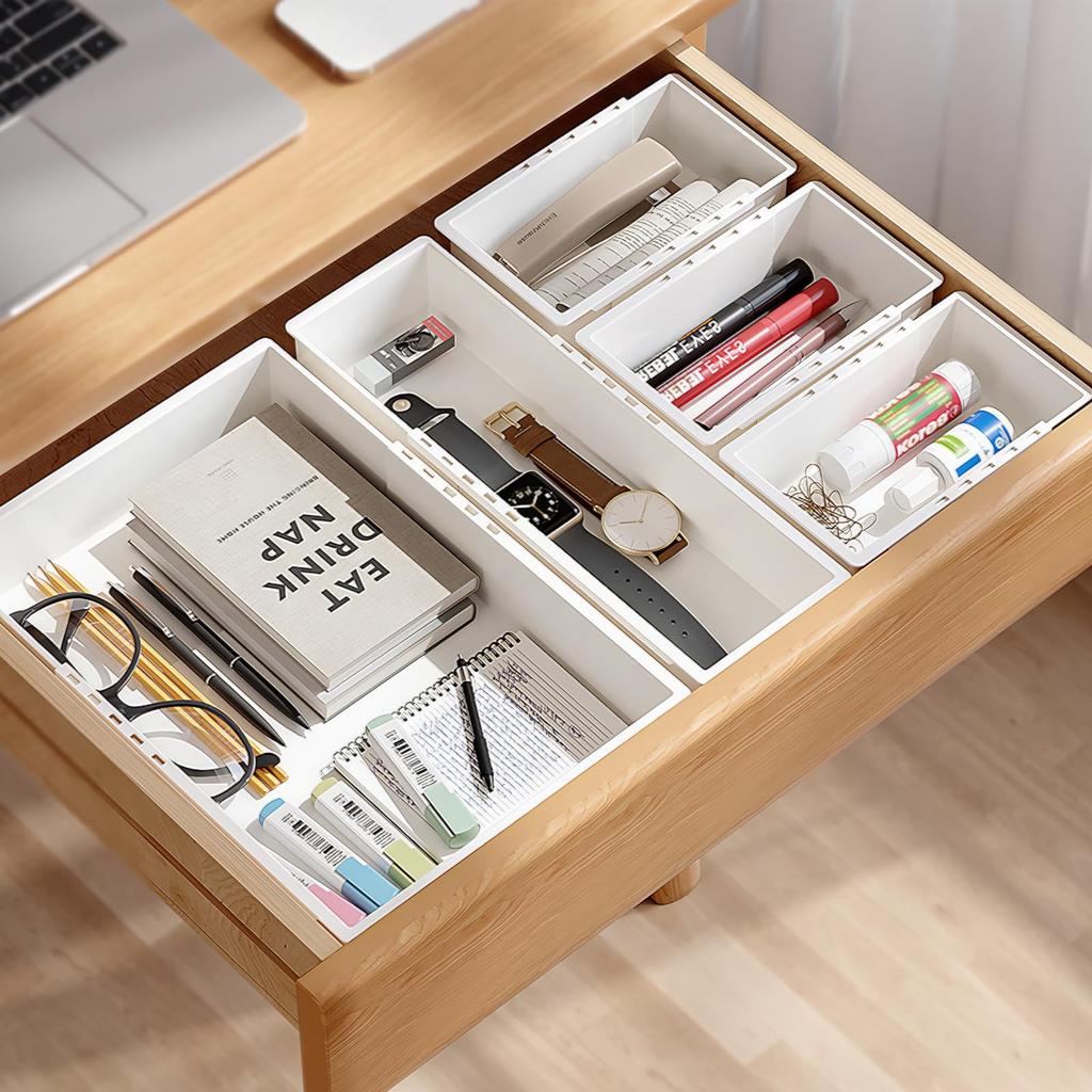 [Wide Range of Uses] Organize and store cluttered drawers. Makes accessories, stationery, and other items easy to find and retrieve. Three types of trays can be freely combined to suit your storage needs. Recommended for storing kitchen tools, stationery, cosmetics, underwear, and more. The rounded corners make it easy to wipe clean and maintain, perfect for everyday use.