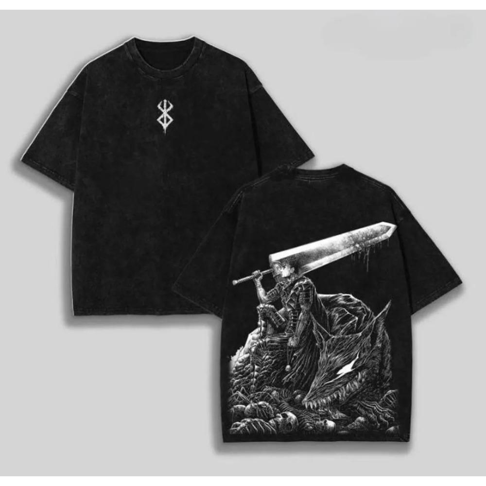 Berserk Guts (Black Swordsman) & Brand of Sacrifice Vintage Washed Double-Sided Anime T-Shirt, Unisex Dark Fantasy Manga Fan Streetwear Tee