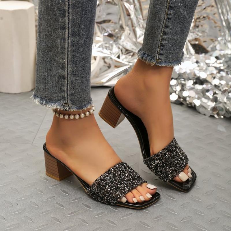 2026 New Summer Thick Heel Temperament on The Outside of Women's Shoes Fashionable Open-toe Rhinestone Large Size