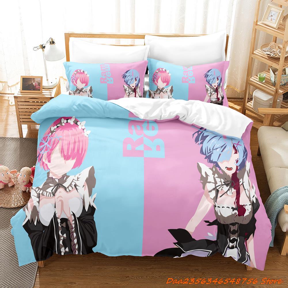 Comforter Re Zero Rem Ram Bedding Set Cartoon Anime Three-Piece Set Adult Kid Bedroom Duvet Sets 3D Kawaii Girl Twin Set