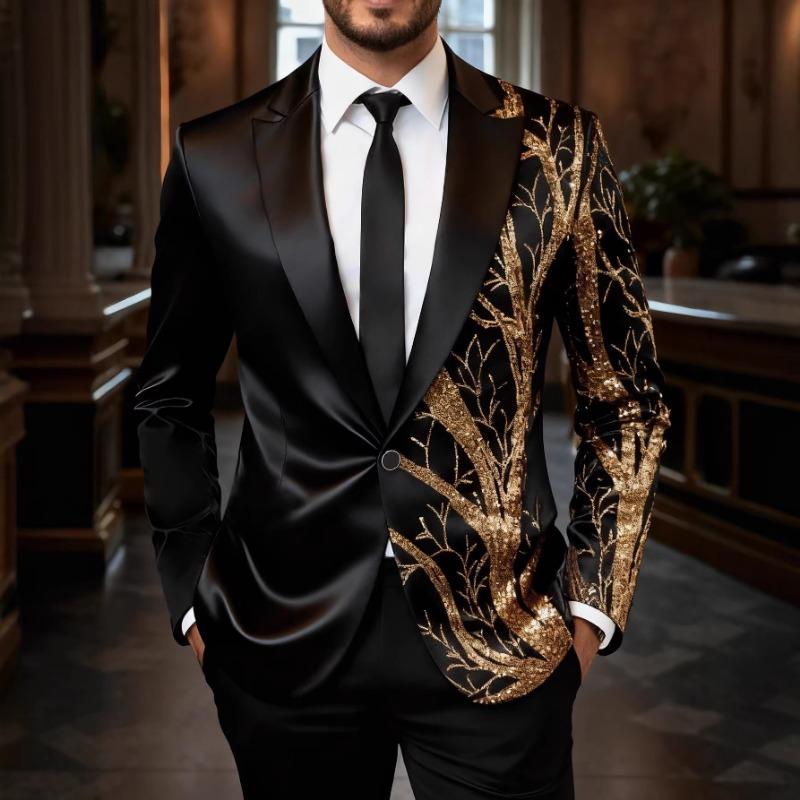 Men's Black Satin Blazer with Gold Sequin Scallop Panel One Button Formal Party Tuxedo Jacket