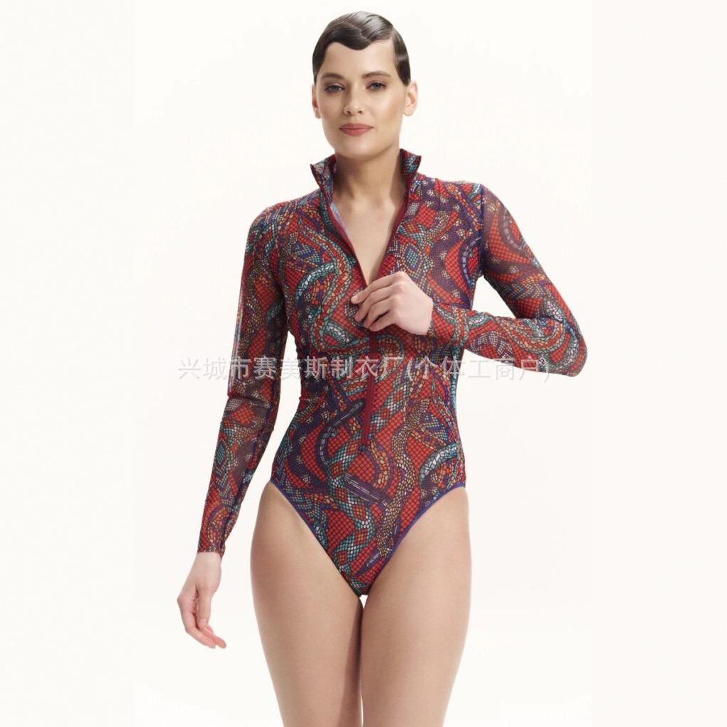 Dive into style with this chic one-piece long-sleeve swimsuit, designed for women who appreciate both European and American fashion influences. This swimsuit features a convenient zipper closure and striking print decorations that enhance its modern appeal. Made from high-quality polyester, it promises comfort and durability, making it perfect for beach outings or poolside relaxation. Feel confident and stylish as you enjoy the sun and surf in this elegant swimwear piece.