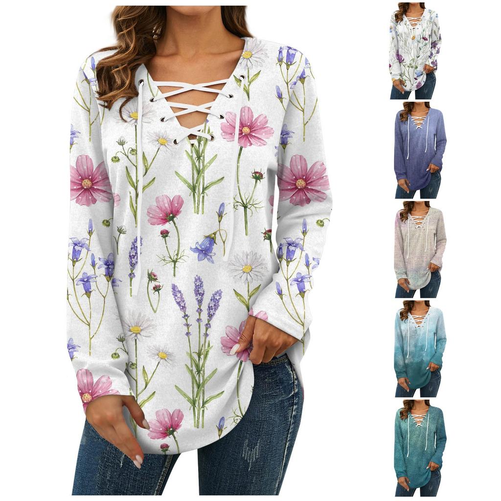 Ladies Atmospheric Fashion Loose Casual Tie Print V-Neck Long Sleeve Top
