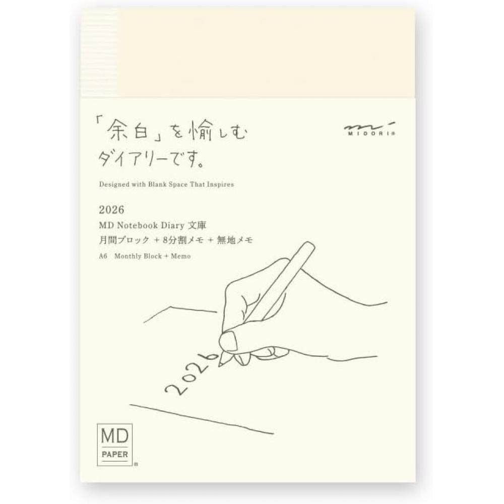 The DESIGNPHIL Midori MD Notebook Diary for 2026 is a product that harmoniously combines the fun of writing freely with the original function of a diary. It is composed of a block-type monthly schedule, horizontally ruled memoranda in eight sections, and blank memo pages, allowing various usages. The monthly schedule provides a high level of freedom with space for notes or to-do lists and idea sketches alongside a month's agenda.