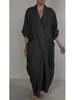 Discover elegance and comfort with this casual, loose-fitting bathrobe dress crafted from a luxurious blend of cotton and linen. Designed for both style and functionality, it features a chic V-neckline and convenient pockets, allowing for effortless daily wear. The solid color and subtle slit design add a touch of modern sophistication, making it a versatile addition to your autumn wardrobe. Perfect for lounging or casual outings, this bathrobe dress provides a seamless blend of style and comfort.