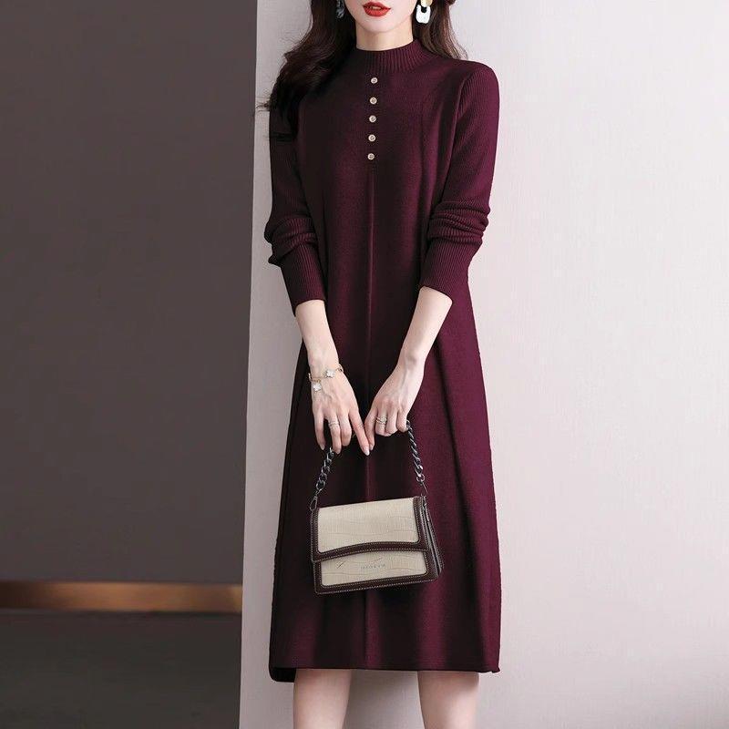 2025 Women's Elegant Half-High Collar Wool Knit Dress for Autumn and Winter