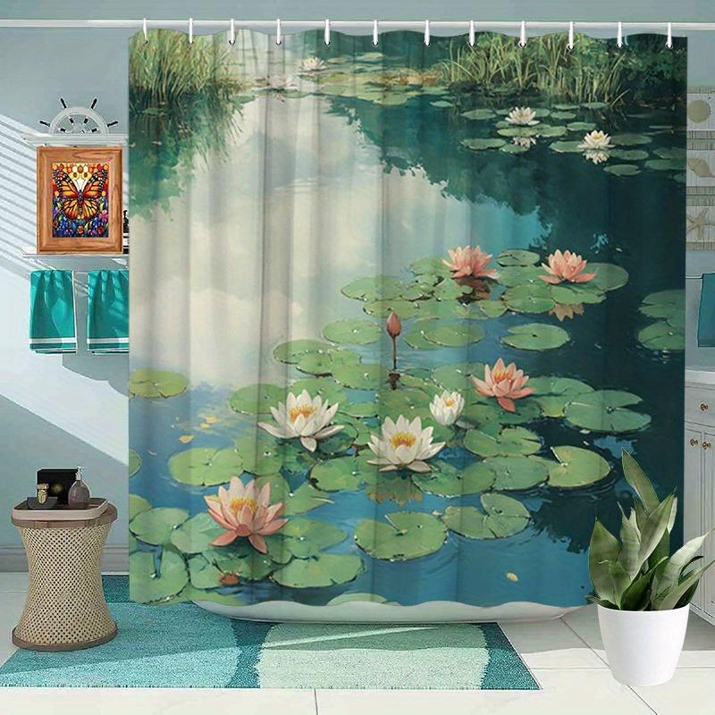 1pc White Pink for Lotus Pond Shower Curtain - Calm Floral Bathroom Decor, Serene Lily Pad Design for Modern Bathrooms