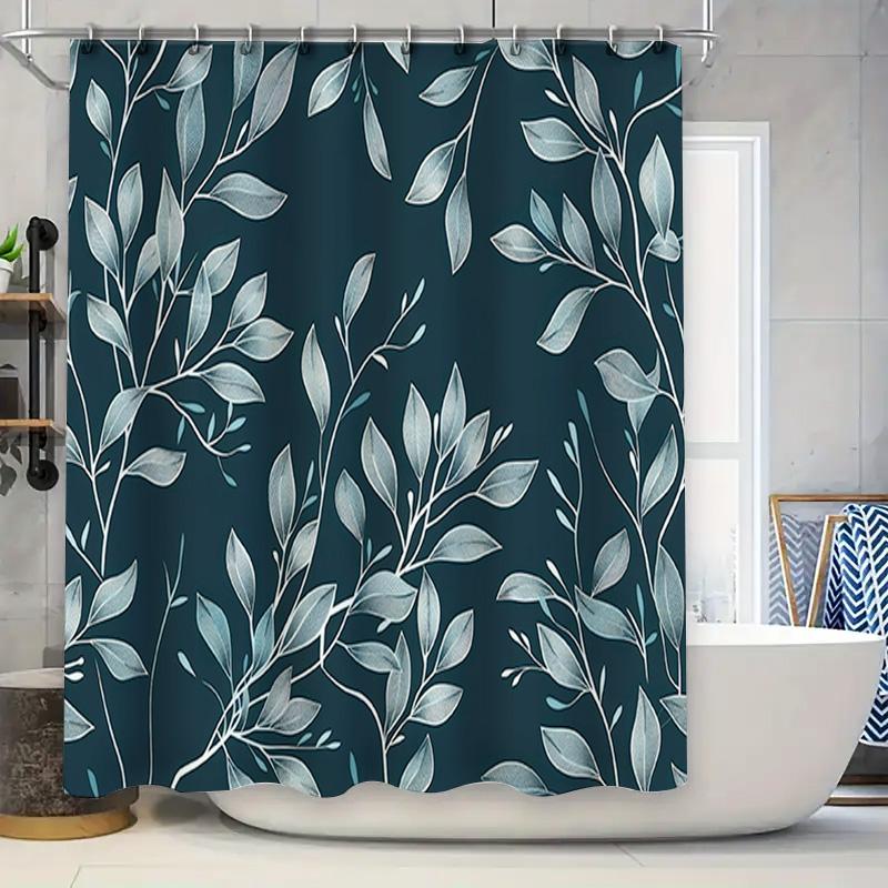 Modern Grey Leaf Print Shower Curtain Waterproof Bath Rug Decorative Home Decoration Blue White
