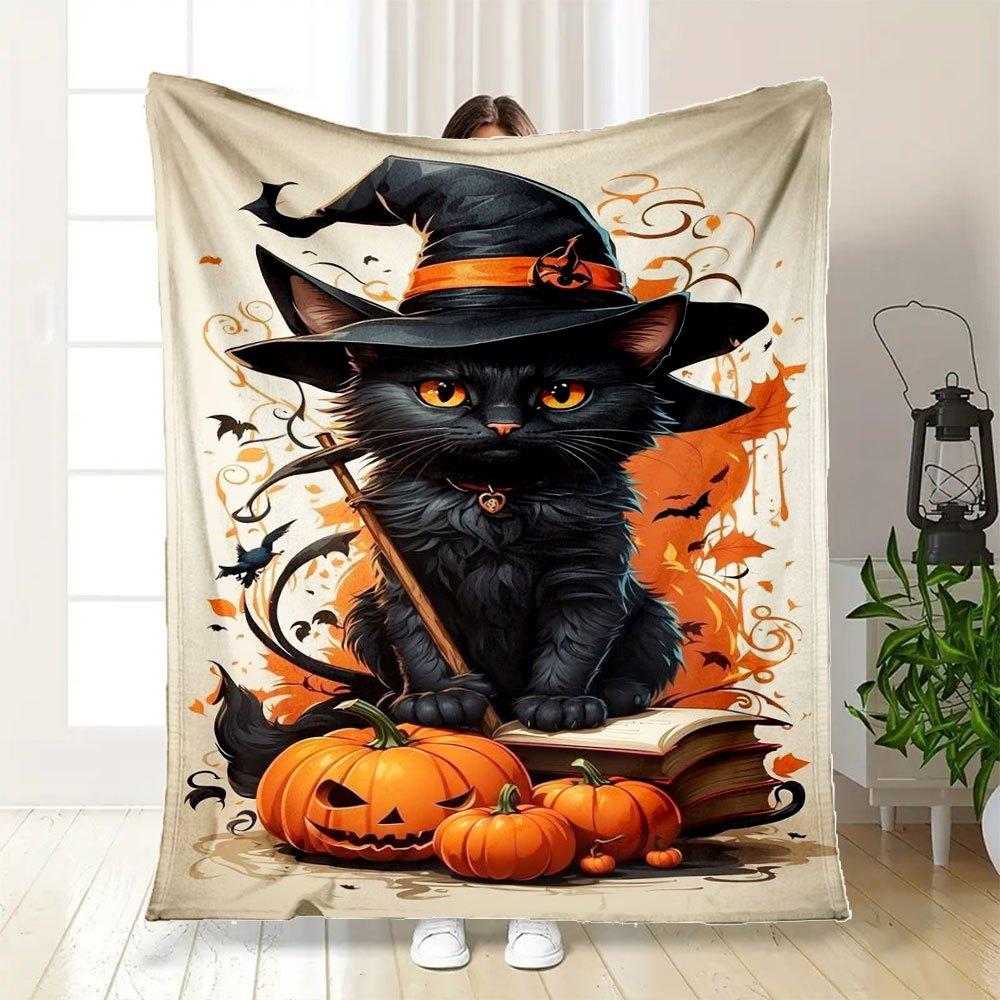"Halloween Witch Cat Decorations - Spooky Black Cat with Hat"Blanket Flannel Throw Blanket for Sofa, Bed, Travel, Camping, Office