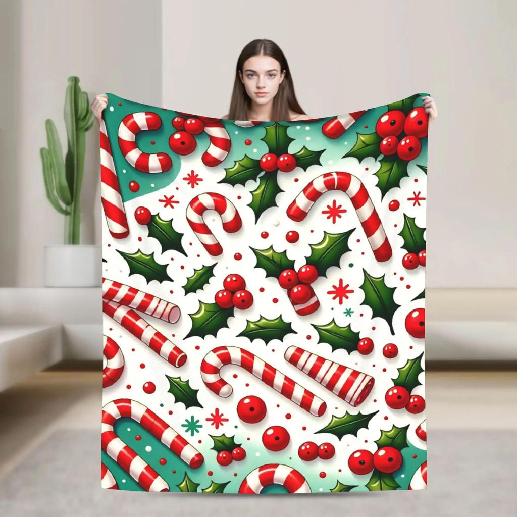 Cozy Candy Cane Christmas Blanket Warm Soft Plush Throw for Bedroom Living Room Couch Decorative Flannel Bedspread