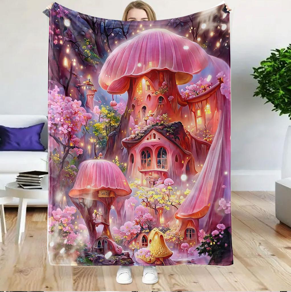 Pink Dreamy Mushroom House Cozy Fluffy Flannel Blanket for Home Living Sofa Chair Room Bedroom Decor for family Birthday Gift