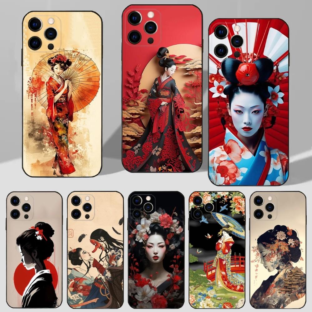 Japanese Geisha W-Woman Phone Case For iPhone 16,15,14,13,12,11 Plus,Pro Max,XS,X,XR,SE,Mini,8,7 Soft Silicone Black Cover