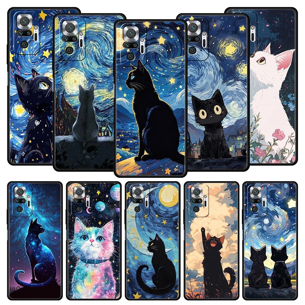 Cat Van Gogh Starry Sky Phone Case For Xiaomi Redmi Note 14 13 5G 10 11 12 Pro Plus 4G 14C 13C 12C 10C Black Cover