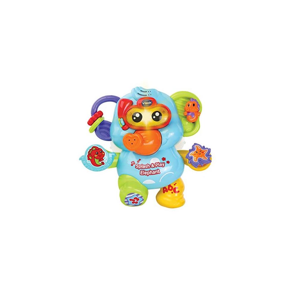 Product DescriptionProduct Description Introducing the splash & play elephant by Vtech! this cute and Happy elephant just loves to play and spray water from his trunk making bath time fun for your little one! features 2 manipulative beads, spring back seahorse, spinning starfish, wobbling water container, twisting foot, sliding leg and scoop accessory for hours of fun bath play. Press the light up snorkel button for fun phrases and sounds that encourage water play. The splash & play elephant promotes language skills with 4 sing-along songs and 15 melodies. Teaches basic numbers and cleanliness concepts which make bath time both fun and educational! Box Contains toy