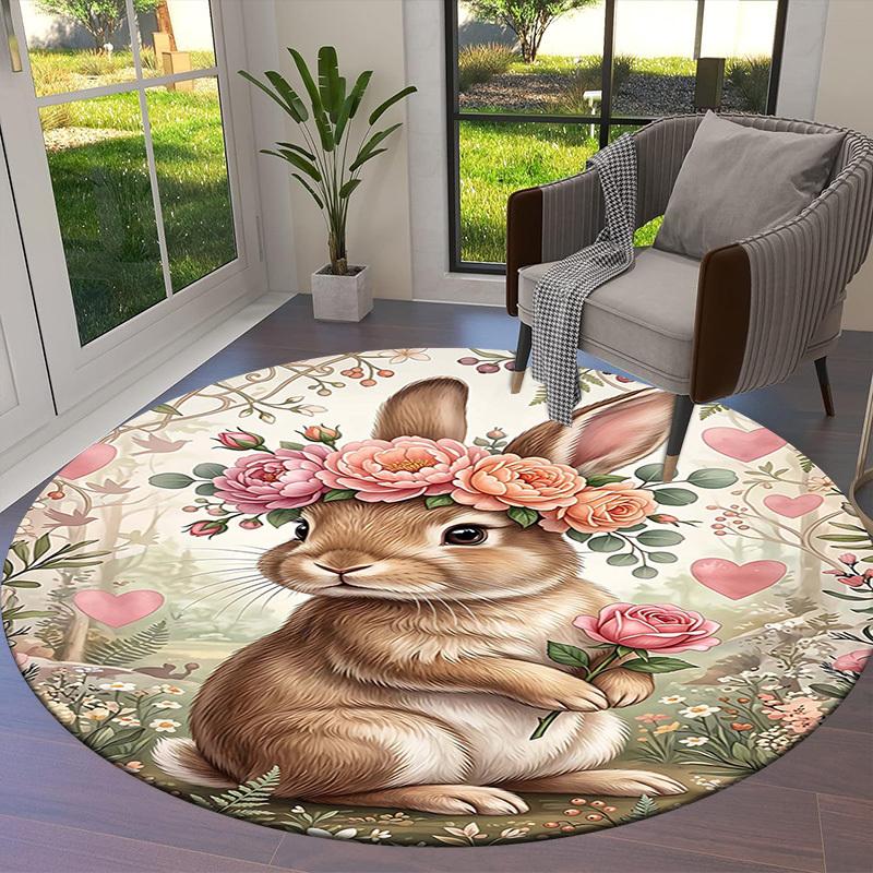 1PC Floral Bunny Non-Slip Floor Round carpet, Office, family, bedroom, Large Area Rug Indoor Rugs, Durable Polyester-L0413