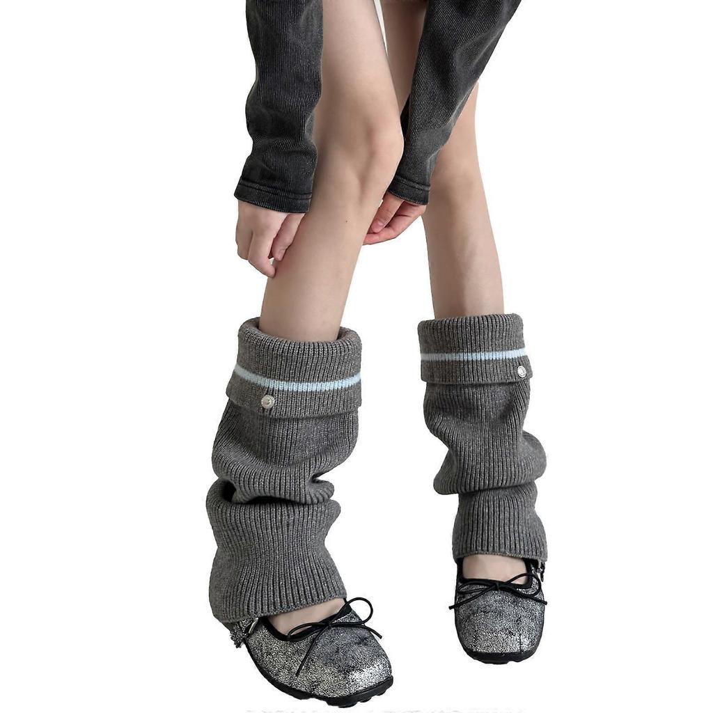 Women Korean Style Knitted Leg Warmers with Metal Button Elegant Turn Cuff Striped Boot Covers Flared Slouchy Calf Socks Gray