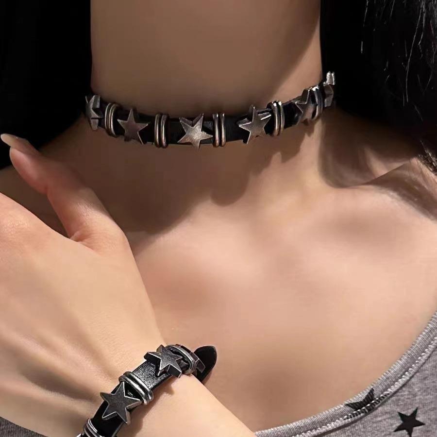 Dark babes wind retro pentagram star leather choker collar female niche design collarbone chain punk necklace