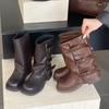 All Leather~ Belt Buckle Medium Boots British Pants Pants Martin Boots Women's Thick Heel Knight Boots Western Pile Boots
