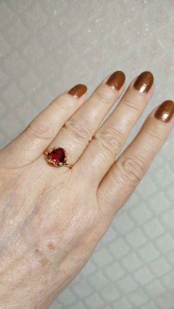 Ringen er nydelig! Dyp rød stein. Formen ligner et hjerte. Veldig lik gull. Veldig fornøyd!