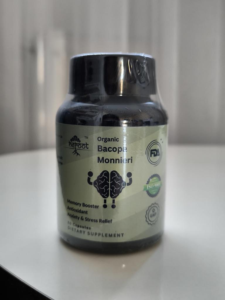 ❤️👍Økologisk Bacopa Monnieri fra Heroot (India) Bacopa Monnieri er en velkjent ayurvedisk urt som brukes til å forbedre hukommelse, konsentrasjon og funksjon av nervesystemet. I India brukes det som et kraftig nootropicum for å hjelpe mot stress, mental tretthet og angst.. Organisk Bacopa Monnieri fra Heroot er et naturprodukt laget i India uten tilsatte syntetiske stoffer. Den kommer i kapselform og er beregnet på personer som ønsker å forbedre kognitiv funksjon og generell velvære.. Kapslene er små og enkle å svelge.. Etter 7-14 dager med vanlig bruk, kan du merke følgende endringer:: ✔ Forbedring av minne og hastighet på å huske informasjon. ✔ Økt konsentrasjon og oppmerksomhet. ✔ Redusert angst og stress. ✔ Generell forbedring av kognitive funksjoner. ✔ Mild beroligende effekt uten døsighet. Bacopa Monnieri opptrer skånsomt, uten de plutselige energitoppene fra koffein, men gir samtidig en stabil forbedring av mental ytelse.. Den tas best om morgenen eller ettermiddagen, da Bacopa Monnieri kan være litt energigivende.. Organisk Bacopa Monnieri av Heroot er et kvalitetsindisk nootropisk middel som virkelig hjelper til med å forbedre hukommelsen, oppmerksomheten og den generelle helsen til nervesystemet. Passer både for studenter og personer som jobber under stressende forhold. Hvis du ser etter et naturlig, kjemikaliefritt hjernestøtteprodukt, er dette verdt et forsøk..