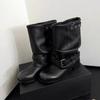 Krazing Pot Cow Suede Nubuck Autumn Winter Shoes Fashion Boots Round Toe Keep Warm Med Heels Belt Buckle Decoration Mid-calf Boots